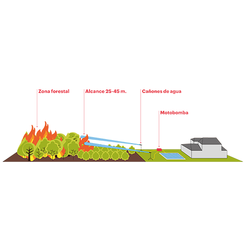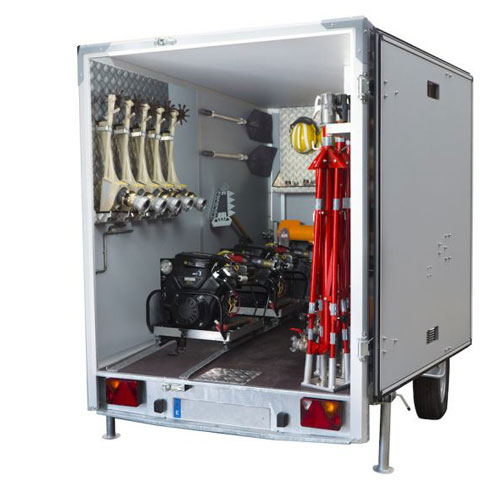 נגרר ייעודי המכיל ערכת ההגנה העצמית החדשה של Vallfirest תוכננה להגן על אזורים מפותחים, בתים מבודדים, אתרי קמפינג, אזורי פנאי ו/או מבנים מבודדים באזורים מיוערים (ממשק פראי-עירוני) מפני שריפות פרא.